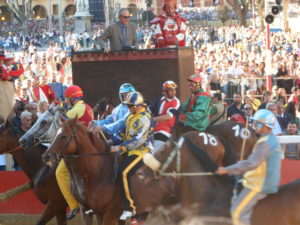 Alle ore 16, fra l’eccitazione del pubblico che gremisce la piazza, si dà il via alla Corsa del Palio, con cavalli montati “a pelo”- senza sella -; tre batterie da sette cavalli, finale da nove.