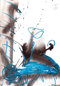 La pittura di Roland Kraus s’iscrive nella corrente dell’espressionismo astratto, nutrita al tempo stesso di spiritualità orientale e di iconografia arcaica. La sua ricerca é di ordine spirituale, da cui deriva l’interesse per i miti orientali che lo riportano alle origini, agli archetipi sepolti nell’inconscio collettivo, alle forze basilari della vita. Da qui anche la sua predilezione per la pratica della gestualità, in quanto tecnica che consente di versare sulla tela pura energia vitale, senza transitare per la mente, in un superamento di sé, uno stato di trance simile ad una danza sacra. In effetti, solo la sintesi tra Oriente e Occidente gli offre un inizio di risposta alla problematica spirituale. Nel 1985, trasferitosi da Berlino a Bruxelles, nell’atmosfera della città europea, tesa alla costruzione della casa comune, in superamento dei passati conflitti nazionali, percepisce la necessità di volgersi indietro, in un ultima valutazione del percorso di un figlio tedesco della guerra. Scultura. Nascono cosi 8 stele di ricordo, denominate “ totem di lutto per una vita in piedi”. Questa rivisitazione di un passato doloroso si realizza tramite una nuova materialità: cemento, legno bruciato, resti calcinati, frantumi di specchi. Altro aspetto del suo lavoro, i momenti più intimi, meditativi, vicini all’arte orientale, trovano espressione sul supporto cartaceo, sovente Fabriano, mediante tecnica mista, disegno, acquerello, pittura acrilica, carboncino. I collages sono opere recenti, ricomposizione di antichi lavori lacerati e diversamente assemblati in un riutilizzo giocoso dei frammenti del passato in forme attuali.