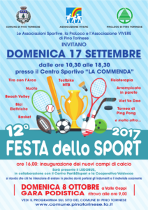 Domenica 17 dalle h. 10,30 alle h. 18,30 dodicesima edizione della Festa dello Sport all’area della Commenda in via Valle Miglioretti promossa dall’associazione Vivere con la collaborazione delle altre associazioni sportive. Si potranno conoscere e provare molte discipline sportive (Tiro con l’arco, Nuoto, Beach volley, Bici elettriche, Basket, testbike Mtb, Fisioterapia, Arrampicata in parete, Viet vo dao, Ping pong) così come spiegato nel masterplan con tutti gli orari di inizio delle dimostrazioni. Sarà presente il Ludobus. Alle h.16,00 inaugurazione dei nuovi campi di calcio.
