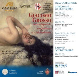 Fondazione Ottavio Mazzonis, Torino; Regione Autonoma Valle d’Aosta; Palazzo Vittone, Pinerolo; Galleria Nazionale d’Arte Moderna, Roma; Raccolte Frugone, Genova Nervi) e sono suddivise in quattro sedi istituzionali, ognuna delle quali propone un differente percorso volto ad approfondire i diversi aspetti della figura di Grosso: a Cambiano, presso il Palazzo Comunale; a Torino, presso la Pinacoteca dell’Accademia Albertina, il Museo di Arti Decorative Accorsi-Ometto e Palazzo Madama. La storia e il percorso del pittore piemontese comincia idealmente nella Sala del Consiglio del Palazzo Comunale di Cambiano. Il «corpus» di opere e di documenti, qui esposti, concorrono a delineare la vita e la storia artistica di Grosso: si va dagli studi giovanili alla formazione presso l’Accademia Albertina, dai ritratti dei genitori a quelli dei figli e della moglie Carolina. Si notano i quadri della raccolta del Comune di Cambiano, dell’Accademia Albertina e di collezionisti privati. Tale sezione, perciò, permette di conoscere i momenti salienti di un percorso che nel 1895 ha raggiunto l’importante palcoscenico della Biennale Internazionale di Venezia, dove il quadro «Il supremo convegno» fece così tanto scalpore da essere condannato dal Patriarca Giuseppe Sarto, il futuro Pio X. Tra le altre opere, emerge, anche, imponente e suggestivo, «Il Pater Noster». Nelle sale della Pinacoteca dell’Accademia Albertina di Belle Arti, attorno all’autoritratto dell’artista, viene descritta l’opera del Maestro Giacomo Grosso, per decenni alla guida della Cattedra di Pittura. In questo contesto si possono scoprire in mostra paesaggi e vedute urbane, bozzetti inediti, nature morte, composizioni floreali, ritratti e nudi femminili, tutte opere di assoluto rilievo. Tra i capolavori allestiti in Pinacoteca spiccano «La nuda» del 1896, proveniente dalla GAM di Torino, i sontuosi ritratti di Umberto I, della Regina Elena e di Vittorio Emanuele III di Savoia, fino al dipinto su cui Grosso diede l’ultima pennellata poco prima di morire, nel 1938. Particolarmente affascinante è la sezione «Studium», curata dal Direttore Salvo Bitonti e da Fabio Amerio, che propone la ricostruzione dello studio di Giacomo Grosso all’interno dell’Accademia attraverso le sorprendenti fotografie autocrome stereoscopiche scattate all’inizio del Novecento da Ferdinando Fino, mentre un video, realizzato con la collaborazione di Lino Strangis, racconta il mondo pittorico dell’artista con una tecnica raffinata e innovativa («painting motion»).