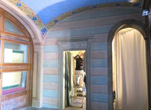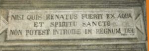 Nella chiesa di San Giorgio, dopo il restauro delle cappelle di Sant’Onorato e del Crocifisso, Michelangelo Varetto e il suo laboratorio hanno condotto a buon punto quello, finanziato dal Comune di Chieri, dei locali attigui all’ingresso principale della chiesa di San Giorgio: cioè dell’ampio atrio che fa seguito alla “bussola” e dei due vani ad esso attigui, uno dei quali custodisce la campana del 1452 (una delle più antiche del Piemonte, rimossa dal campanile perché rovinata), l’altro, nel 1902 , dal parroco don Olivero adibito a cappella della Madonna di Lourdes (purtroppo, non si sa bene perché, recentemente eliminata. Forse per riportare all’antico tutto questo settore della chiesa. Senza considerare che si cancellava una pagina non marginale della storia della stessa e della parrocchia). Nell’atrio il restauro è consistito nell’asporto di varie ridipinture eseguite nell’Otto e Novecento e nel riportare alla luce la colorazione originale settecentesca delle pareti (probabilmente risalente all’epoca del rifacimento della facciata ad opera di Bernardo Vittone) e quella di fine Ottocento della volta, azzurro-stellata e con bella cornice neogotica. E’ riapparsa anche una elegante cornice dipinta attorno alla porta che introduce al locale della campana. Sul frontone vi compare, molto frammentaria ma ben leggibile, una frase del Vangelo di San Giovanni (Giov. 3,5): “Nisi quis renatus fuerit ex aqua et Spiritu Sancto, non potest introire in regnum Dei” (“Se uno non rinasce in acqua e Spirito Santo, non può entrare nel regno di Dio”): particolare che conferma quanto era già noto: cioè che in questo locale, che formava un tutt’uno con quello attiguo, durante il “periodo francese”, quando la chiesa di San Giorgio divenne chiesa parrocchiale, venne sistemato il fonte battesimale. Fu diviso in due, con la conseguente creazione di una seconda grande porta con arco a tutto sesto, forse nel Novecento, proprio per ricavarvi la cappella di Lourdes.