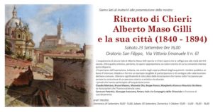 “Ritratto di Chieri: Alberto Maso Gilli e la sua città (1840 – 1894)”: in mostra le opere del pittore chierese Alberto Maso Gilli (1840-1894), artista di fama che partecipò in maniera significativa ai restauri ottocenteschi del Duomo con suoi importanti contributi. In occasione delle Giornate Europee del Patrimonio, due week end in esposizione alla Cappella San Filippo. La mostra, inaugurata sabato 23 settembre, è ancora visitabile nella Cappella della Chiesa di San Filippo Sabato 30 settembre e domenica 1 ottobre 2017, via Vittorio Emanuele II 61, ore 16-19.