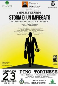 Sabato 23/9 alle h.21,00 al Teatro Le Glicini uno degli album più emozionanti di Fabrizio De André, portato in scena con un racconto spettacolo. La musica dal vivo delle Malecorde e la voce narrante di Paolo Montaldo per un viaggio tra gli “anni di piombo” e i nostri anni della crisi. Chi è l’impiegato? Da cosa si sente escluso? Quali sono i suoi rimpianti e i suoi desideri? Le risposte sono nella musica e nelle parole di Fabrizio De André, portate in scena nel racconto spettacolo che ha il titolo dell’album pubblicato nel 1973. Ai brani, eseguiti dal vivo, si alternano i momenti di parola che ripercorrono il risveglio tardivo dell’impiegato e la sua illusoria rivoluzione terminata con la sconfitta personale e affettiva: un viaggio tra passato e presente, tra gli “anni di piombo” e gli anni della crisi che stiamo vivendo. In scena Paolo Montaldo, autore del testo, che, dopo aver riportato alla memoria la tragedia del 6 dicembre 2007 con “C’era una volta la Thyssen”, ha voluto rendere omaggio al cantautore-poeta genovese con questo spettacolo. Al suo fianco, le Malecorde: un gruppo che, accanto ai brani originali, da sempre ha nel suo repertorio canzoni di Fabrizio De André, composto da Giovanni Battaglino, Matteo Bagnasco, Lucia Battaglino, Simone Rossetti Bazzaro, Paolo Mottura, Eugenio Martina. Un appuntamento per chi ricorda a memoria le parole cupe e poetiche di questo album e per chi vuole sentirlo raccontare per la prima volta.