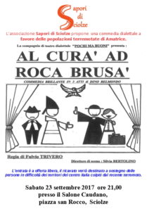 L’associazione Sapori di Sciolze in collaborazione della compagnia teatrale dialettale piemontese Pochi ma Buoni presenta “Al Curà ad Roca Brusà” una commedia brillante di Dino Belmondo con la regia di Fulvio Trivero. La commedia avrà la finalità di raccogliere fondi a favore della popolazione di Amatrice colpita dal terremoto. Sabato 23 settembre 2017 ore 21,00 presso il Salone Caudano in piazza san Rocco a Sciolze. Una serata di divertimento con entrata ad offerta libera per uno scopo benefico.