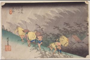 La galleria delle stampe al secondo piano del percorso espositivo del Giappone dal 3 ottobre ospiterà la seconda metà della serie più famosa di Utagawa Hiroshige (1797-1858), “Le 53 Stazioni della Tokaido”, datata 1833-34. Si tratta di xilografie policrome dove il maestro, principale rivale di Katsushika Hokusai (1760-1849) per le opere paesistiche, rivela il suo massimo talento. La stazione “Pioggia bianca a Shono”, ad esempio, è considerata a buon titolo una dei capolavori assoluti di tutta l’arte dell’ukiyo-e. La serie di 55 stampe conservata al MAO, completa e di buona qualità, è di proprietà della UniCredit Art Collection – Milano. Oltre al corpus principale della Tokaido saranno esposti dei surimono (stampe augurali), due dei quali piuttosto particolari perché collegati alla commemorazione dei defunti. Contestualmente verranno sostituiti otto kakemono (dipinti da appendere in formato verticale), tra le opere principali un dittico sei-settecentesco di samurai a cavallo di Kano Chikanobu e un finissimo “Uccello marino su uno scoglio” dipinto a inchiostro su seta da Shibata Zeshin. A partire dal 17 ottobre i visitatori del MAO potranno ammirare tre kesa – delle specie di mantelli monastici – databili alla fase finale del periodo Edo (XIX secolo, prima del 1868). Il più antico – e il più grande (120 x 205 cm) – raffigura a broccato dei draghi in volo e motivi di onde su fondo bianco, utilizzando sete colorate e delicate striscioline metalliche. Non meno prezioso è un kesa di satin blu scuro decorato con draghi e crisantemi, o l’altro a motivi floreali su un fondo rosso molto intenso: quest’ultimo, sulla fodera, presenta degli stemmi nobiliari con rami di paulonia. Nella stessa sala verrà ripresentato un notevole paravento a due ante con un sigillo di Ogata Korin (1658-1716), uno dei più noti rappresentanti della scuola Rinpa. Raffigura lo scorcio fiabesco di un boschetto d’invenzione, probabilmente riconducibile a Tatebaiashi Kagei (attivo a metà del XVIII secolo), uno degli allievi più dotati del maestro.