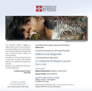 Giovedì 5 ottobre 2017 alle ore 16 nella sede del Consiglio regionale (via Alfieri 15 a Torino) apre al pubblico la Galleria Carla Spagnuolo, con la mostra intitolata “La collezione di Palazzo Lascaris”, realizzata in collaborazione con l’associazione culturale Magica Torino.