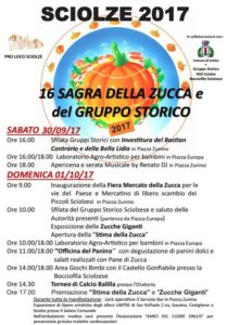Sabato 30 settembre e domenica 1 ottobre si svolgerà a Sciolze la 16 Sagra della Zucca.Sabato vedrà protagonisti il Gruppo Storico sciolzese e un centinaio di maschere provenienti da molti paesi.La sera intrattenimento musicale e apericena. Domenica protagonista la fiera con prodotti di eccellenza del territorio che insieme a mostre d’arte e di fotografia, giochi per bambini e le zucche giganti e tante attività per tutti allieteranno la giornata di festa.