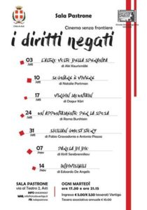 Prende il via domani, martedì 3 ottobre, la rassegna cinematografica “Cinema Senza Frontiere” curata dal Circolo Vertigo. Sette film sotto il segno dei “Diritti negati”, tema del ciclo di proiezioni dell’edizione 2017 che si terrà in Sala Pastrone.