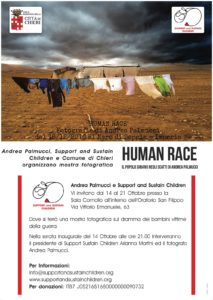 Support and Sustain Children con il patrocinio del Comune di Chieri, organizzano nella sala Comollo a San Filippo una mostra fotografica “Human Race” sul dramma dei bambini nei campi profughi. Dal 14 al 21 Ottobre. Nella serata inaugurale del 14 Ottobre interverrà Andrea Palmucci fotografo ufficiale dell’associazione e autore degli scatti e la presidente dell’associazione Arianna Martini.Verranno trasmessi filmati che illustreranno le attività dell’associazione.