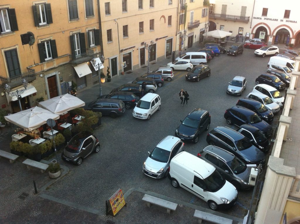“Ogni giorno piazza Umberto, il salotto di Chieri, integrato dal salottino di piazza Mazzini, presenta il quadro penoso testimoniato dall’immagine che allego, ripresa da Antonio Prochilo, che gentilmente me l’ha inviata. 22 autovetture posteggiate negli stalli previsti restringono la vista e il passaggio, ad essi si aggiungano le numerose autovetture che vengono piazzate in seconda fila, con arrogante naturalezza. A mio parere almeno uno dei lati andrebbe liberato dall’ingombrante presenza, nel migliore dei casi entrambi. Chi è che parcheggia in quegli stalli? Si dice che siano i negozianti, non i clienti (a a parte qualche pigrone che per consumare un aperitivo posteggia impunemente accanto al caffè, non sia mai che compia a piedi un passo o due…). Quindi, il posteggio non sarebbe destinato alla clientela, in modo da rendere possibile un rapido ricambio di utenti e favorire i guadagni, ma al posteggio parassitario degli esercenti. Pare opportuna una verifica, per sostenere le affermazioni che qualcuno potrebbe trovare azzardate. In ogni caso, quella bella piazzetta, che in ogni altra città d’Italia vedremmo sgombra dalle lamiere, dedicata alla sosta e alle relazioni, viene quotidianamente maltrattata. Urgono scelte forti, in pro del pubblico, che sarebbero molto positive anche per il commercio: uno spazio così attraente consentirebbe alle famiglie, ai gruppi, ai singoli quella libertà e quella piacevolezza che ci dispongono all’acquisto, al passeggio, alla scoperta di prodotti interessanti nelle belle vetrine della città. Occorrono il coraggio delle amministrazioni e la fiducia dei commercianti e degli esercenti, la consapevolezza dei cittadini e l’entusiasmo di tutti. Discutiamone, cerchiamo sedi di dibattito, troviamo soluzioni, ma -orsù- fermiamo il malcostume e doniamo uno spazio rinnovato alla cittadinanza!”