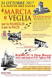 Il Comitato per gli Anniversari della nascita e della morte di San Domenico Savio organizza la “Marcia e Veglia per le famiglie e per la pace” che si terrà il giorno 31 ottobre 2017. La Marcia concluderà le celebrazioni legate agli Anniversari della nascita e della morte di San Domenico Savio. Un particolare ricordo verrà a Lui dedicato sia nella sosta presso la Parrocchia di Sant’Andrea in Castelnuovo don Bosco dove il Santo ricevette la Prima Comunione (alla quale fu ammesso eccezionalmente all’età di soli 7 anni) e la Cresima, sia durante la sosta alla casetta di Morialdo dove “Minot” visse per quasi 10 anni. Promotori dell’iniziativa la Basilica Don Bosco, la Parrocchia Sant’Andrea Apostolo di Castelnuovo don Bosco, i Salesiani Cooperatori di Castelnuovo/Colle don Bosco, il Comune di Castelnuovo don Bosco e l’Associazione La Cabalesta. Più in dettaglio la Marcia partirà dalla Abbazia di Vezzolano nel Comune di Albugnano alle ore 17,15 del 31 ottobre. Prima tappa la Chiesa di Sant’Andrea Apostolo in Castelnuovo don Bosco dove saranno ricordati San Domenico Savio e gli altri Santi castelnovesi e dove saranno rinnovati dai partecipanti gli impegni battesimali. A seguire “un panino ristoratore in amicizia”. Seconda tappa la casa di San Domenico Savio in Frazione Morialdo. Arrivo al Colle don Bosco dove è programmata una Veglia alle ore 21,00 alla quale seguirà un Santa Messa alle ore 21,30 celebrante Don Enrico Stasi, Ispettore dei Salesiani del Piemonte e della Valle d’Aosta. Naturalmente è prevista la possibilità di partecipare anche solo alle celebrazioni presso Sant’Andrea e presso il Colle e di inserirsi nella Marcia da Sant’Andrea o da altro luogo sulla strada del Papa che collega Castelnuovo al Colle don Bosco. Ai partecipanti si consiglia di indossare scarpe adeguate, una giacca a vento o un K-way per riparasi dal fresco serale, un ombrello per eventuale pioggia e una torcia elettrica sufficiente ad illuminare il sentiero (specie nel tratto Abbazia di Vezzolano – Sant’Andrea). Per chi avesse piacere è previsto un servizio navetta dal Colle a Vezzolano con partenza alle ore 16,30 (vedi locandina). In caso di cattivo tempo il ritrovo viene spostato alle ore 19,00 in Sant’Andrea Apostolo di Castelnuovo don Bosco.