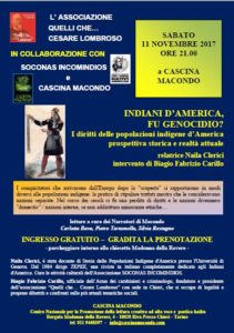 Riprendono gli incontri dell’associazione culturale chierese “Quelli che… Cesare Lombroso”, presieduta da Biagio Fabrizio Carillo, che hanno come tema conduttore la legalità in tutte le sue sfaccettature. La stagione 2017/18, la settima, si aprirà con l’incontro su un tema molto originale, ovvero INDIANI D’AMERICA,FU GENOCIDIO? I diritti delle popolazioni indigene, prospettiva storica e realtà attuale. Relatrice Naila Clerici, che è stata docente di Storia delle Popolazioni Indigene d’America presso l’Università di Genova. Dal 1984 Clerici dirige TEPEE, una rivista in italiano completamente dedicata agli Indiani d’America e cura le attività culturali dell’Associazione SOCONAS INCOMINDIOS. A dare un ulteriore interesse alla serata sono previste letture a cura dei Narratori di Macondo Carlotta Bava, Pietro Tartamella, Silvia Restagno. La serata si svolgerà sabato 11 novembre alle ore 21 a Cascina Macondo, che è Centro Nazionale per la Promozione della lettura creativa ad alta voce e poetica haiku e si trova in Borgata Madonna della Rovere, 4, frazione di Riva Presso Chieri, tel. 011 9468397, info@cascinamacondo.com (vedere locandina in allegato).E’ prevista una diretta streaming sulla pagina Facebook dell’associazione culturale ‘Criminalmente’ che vi invitiamo a visitare per la ricchezza di spunti legati anch’essi ai temi della legalità e del crimine in particolare.L’ingresso è libero a tutti.