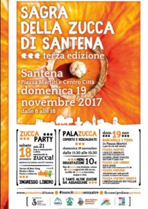Il 19 novembre 2017 dall’alba al tramonto nelle vie del centro di Santena avrà luogo la terza edizione della SAGRA DELLA ZUCCA, organizzata dalla A.T. Pro Loco Santena in collaborazione con Santena E20 e l’Associazione Ristoratori Santenesi. La protagonista sarà proprio lei LA ZUCCA in ogni sua varietà. Non mancheranno colorate bancarelle agroalimentari, artigiani, hobbisti e creativi provenienti da tutto il Piemonte. Per i più piccoli sono previsti spettacoli di intrattenimento di artisti di strada, la possibilità di passeggiate al parco in groppa agli asinelli e ancora giochi gonfiabili e mini tennis. Per gli amanti della cultura vi sarà la possibilità di effettuare visite guidate al Castello e ai luoghi cavouriani con l’associazione degli Amici della Fondazione Cavour (10:30-15:00 e 16:00-17:00) e di poter ammirare la mostra “Zucca su tela” in Sala del Consiglio del Comune a cura dell’AARTES di Santena. Per gli amanti del gusto in piazza Martiri sotto la struttura riscaldata PALAZUCCA si pranzerà con piatti a base di zucca preparati dai migliori ristoratori santenesi con prezzi accessibili a tutti. Per tutto il giorno in piazza e per le vie del centro si potranno gustare Vin brûlé, cioccolata calda, frittelle e le tradizionali caldarroste preparate da I BRUSATARIU DU VILLAR. E poi musica di ogni genere: in piazza Martiri dalle ore 12:00 cover band I SOLITI INSOLITI, segue alle ore 16:00 il suggestivo coro “FREE VOICES GOSPEL CHOIR”; mentre in piazza San Lorenzo gli IDEA 2009 suoneranno musica anni ‘70 ‘80. Inoltre esibizioni balli con Accademia di Ballo Marino Gomez e balli country con OLD WILD WEST. Ma per chi non potesse aspettare, la sera di sabato 18 in piazza Martiri ci sarà lo “ZUCCA PARTY” al PALAZUCCA dalle 21,00 a mezzanotte con panini salsiccia e crauti, birra, sfide a Beer Pong e musica, organizzato dall’associazione DAI e Pro Loco.