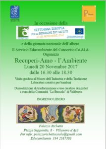 In occasione della Settimana Europea per la Riduzione dei Rifiuti 2017 e della giornata nazionale dell’albero il servizio EducAmbiente del Consorzio di cooperative sociali Co.Al.A., organizza Recuperi-Amo – l’Ambiente, un pomeriggio all’insegna della creatività. L’evento è rivolto ad adulti e bambini e si svolgerà lunedì 20 Novembre 2017 dalle 16.30 alle 18.30 nella bella cornice di Palazzo Richetta a Villanova d’Asti. Saranno proposti laboratori creativi, dimostrazione di trasformazione e uso creativo dei pallet a cura della Comunità “La Bussola” di Valfenera e saranno organizzate visite guidate al Museo dell’Industria e della Tradizione che si trova all’interno di Palazzo Richetta. Le attività sono a ingresso libero. Presso Palazzo Richetta l’Amministrazione Comunale e il Consorzio Co.Al.A. hanno avviato un progetto di Pubblica Utilità che con finanziamenti della Regione Piemonte propone la creazione di un Museo diffuso, percorsi didattici per le scuole e un festival del lavoro. Per la realizzazione del progetto sono stati selezionati 5 tirocinanti che per sei mesi si dedicheranno alla realizzazione del progetto. Recuperi-Amo – l’Ambiente è il primo degli eventi che il gruppo propone alla cittadinanza.