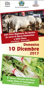 Come ogni anno, nel periodo natalizio a Carmagnola sono tante le iniziative legate ai prodotti tradizionali del territorio. Il 10 dicembre 2017 il Comune dedica un’intera giornata alla zootecnia, alla gastronomia ed al commercio proponendo la “XXV Fiera Regionale del bovino da carne di razza Piemontese e della Giora”, la “IX edizione della Mostra/Mercato del Porro Lungo Dolce di Carmagnola”,