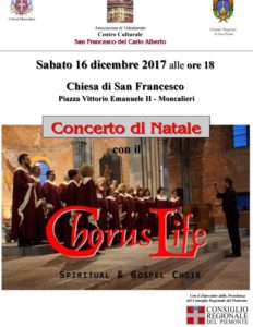 Il Centro Culturale “San Francesco del Carlo Alberto” invita al Concerto di Natale che avrà luogo sabato 16 dicembre presso la chiesa di San Francesco in piazza Vittorio Emanuele II a Moncalieri, dopo la Santa Messa delle 17, con il Chorus Life Spiritual & Gospel Choir