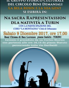 Il Gruppo Storico-Folk “La Bela Rosin e la soa Gent” del Circolo Beni Demaniali, propone la “vià” (veglia) presso la Real Chiesa di San Lorenzo in piazza Castello a Torino, sabato 9 dicembre 2017 alle ore 17. L’evento si richiama alla nascita di Gesù, tratta da un testo di Nino Costa liberamente adattato, dove la naturalezza dell’espressione dialettale nella cultura popolare piemontese si integra all’eterno messaggio Cristico. Anticipa l’evento un corteo partecipato da Gruppi Storici e Folkloristici provenienti da ogni parte del Piemonte, che partirà da piazza Statuto (monumento ai caduti del Frejus e Moncenisio) e percorrerà tutta via Garibaldi per raggiungere la Real Chiesa in piazza Castello ove si darà vita alla scena. La manifestazione si fregia del Patrocinio della Regione Piemonte, del Consiglio Regionale Piemonte, della Città Metropolitana e del Comune di Torino.