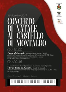 Organizzato dal comune e dal Castello di Montalto – che lo ospiterà nelle proprie sale – il 16 dicembre p.v., la concertista Anna Maria Cigoli, alle ore 20.45, accompagnata da altri musicisti presenta il: GRAN GALA’ DI NATALE. Chi volesse partecipare può anche prenotare la cena al castello – 011 0620566 – alle ore 19.00 al costo di euro 40 di cui euro 5 verranno devoluti in beneficienza alla Associazione V.I.T.A. Onlus.
