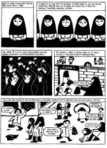 Anche Persepolis è un romanzo a fumetti autobiografico, se pure di stile completamente diverso da Blankets. Marjane Satrapi è iraniana. Nel libro racconta la sua vita a partire dall’età di 7 anni, nei giorni della caduta dello scià e dell’avvento del regime di Khomeyni. Marjane è una ragazzina ribelle, molto sveglia e intelligente. Da qui i toni del racconto, realizzato con uno stile grafico quasi infantile (Marjane Satrapi era illustratrice per libri per bambini), tuttavia efficace e adatto al tipo di racconto.
