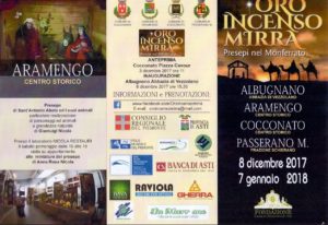L’8 dicembre ad Albugnano è stata inaugurata la seconda edizione della manifestazione “Oro, incenso, mirra. Presepi nel Monferrato”, una rassegna espositiva di arte presepiale organizzata dalle amministrazioni comunali dei paesi di Albugnano, Aramengo, Cocconato e Passerano Marmorito e sostenuta dalla Fondazione Cassa di Risparmio di Asti. Fortemente voluta da tutti i soggetti interessati per la promozione del territorio, concretizza l’unione tra Comuni, associazioni e privati, rappresentando una notevole attrazione turistica per il periodo natalizio.