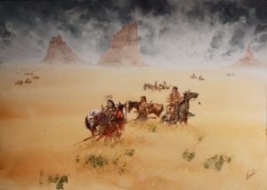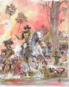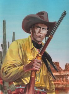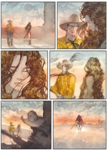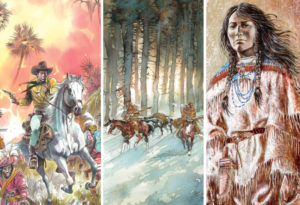 Sergio Tisselli ha disegnato una storia di Tex Willer “Sfida alla vecchia missione”, su testi di Pasquale Ruju, pubblicata sul Color Tex n. 8 del novembre 2015. 32 splendide pagine colorate all’acquerello che sono già state oggetto di una mostra alla Galleria Little Nemo (ne ho parlato nel mio articolo del marzo 2016) e di una pubblicazione in volume in Francia. Il rapporto di Tisselli con il West è poi proseguito anche nella realizzazione di una serie di quadri sugli indiani e sul west, oggetto di litografie e di un portfolio.