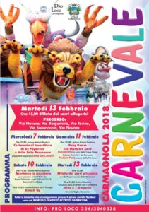E’ tempo di carnevale a Carmagnola. I festeggiamenti avranno il via mercoledì 7 febbraio, alle ore 21,00 presso il Salone Antichi Bastioni, con la cerimonia di investitura di Re Peperone e della Bela Povronera. Presenterà la serata Sonia De Castelli. Sabato 10 febbraio, alle ore 19,30 gli Antichi Bastioni ospiteranno l’Apericena in Maschera, prenotazioni entro l’8 febbraio presso Rosso Pelletterie 339 4813138 oppure al numero 347 1440366. A seguire, dalle ore 21,00 musica dance con il Gruppo Smash up. Domenica 11 febbraio alle ore 15,30 avranno luogo, sempre presso gli Antichi Bastioni, i divertimenti per i più piccoli. In programma, baby dance con Madame Zorà, truccabimbi a cura della Croce Rossa Italiana Volontari del Soccorso e Nutella Party a cura della Pro Loco. Come di consueto il Martedì Grasso sarà dedicato alla sfilata dei carri allegorici. Il 13 febbraio, a partire dalle 15,00 sfilata dei carri con Re Peperone e la Bela Povronera. Il percorso è lo stesso dello scorso anno: partenza da via Novara, via Bergamina, via Torino, via Savonarola, ritorno in via Novara. In serata alle ore 21,00 agli Antichi Bastioni, chiusura dei festeggiamenti con la Grande Veglia Danzante a cura dell’Orchestra “Mike e i Simpatici”. Le iniziative, organizzate dalla Pro Loco Carmagnola, con la collaborazione del Comune, sono ad ingresso gratuito, ad eccezione dell’apericena di sabato 10 febbraio.
