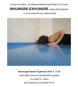 La mostra nello spazio della Cripta di San Michele Arcangelo a Torino accoglie i lavori degli studenti del corso di Tecniche della Scultura dell’Accademia Albertina di Belle Arti che hanno frequentato il workshop dal titolo Inhumare-Exhumare. Il workshop, condotto dall’artista Marina Buratti con il contributo di Ivan Fassio, curatore e organizzatore di manifestazioni artistiche e letterarie, ha avuto come temi principali l’autoscatto e l’autorappresentazione; il mezzo utilizzato è stato la macchina fotografica, strumento che documenta e fissa l’attimo, attimo che svela le impercettibili varianti del rapportarsi con il proprio essere. Le materie da plasmare nello spazio sono state la propria fisicità e la propria interiorità. Ogni studente coinvolto si è messo in gioco e ha elaborato, documentato e fatto riemergere una parte di sé.