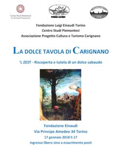 Mercoledì 17 gennaio, alle ore 17, nella sede della Fondazione Einaudi – Via Principe Amedeo 34 – Torino, per iniziativa del Centro Studi Piemontesi, della Fondazione Luigi Einaudi e dell’Associazione Progetto Cultura e Turismo Carignano, conferenza di Paolo Castagno sul tema “La dolce tavola di Carignano” – “’l ZEST”. Riscoperta e tutela di un dolce sabaudo