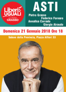 Asti- Pietro Grasso apre la campagna elettorale di Liberi e Uguali questo pomeriggio al Palazzo della Provincia