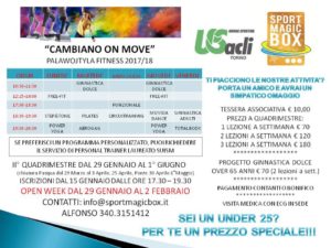 L’associazione sportiva “Sport Magic Box” propone al PalaWojtyla di Cambiano il II° quadrimestre sportivo di “Cambiano on move” fitness 2017-2018 con inizio lunedì 29 gennaio fino a venerdì 1° giugno. Le iscrizioni sono nella struttura di via Campi Rotondi dalle 17,30 alle 19,30, con visita medica e ECG in sede.