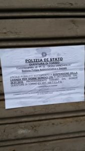 E’ stato notificato al titolare dell’esercizio di vicinato “King – Kebab e Pizza” di corso Principe Oddone 40 il provvedimento cautelare emesso dal Questore di Torino che impone la sospensione della licenza per l’esercizio pubblico in questione, con conseguente ed immediata chiusura al pubblico dei locali per 15 giorni.