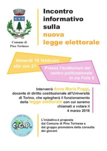 Una bella ed utile proposta del gruppo dei ragazzi che sta lavorando alla fondazione della Consulta Giovani di Pino Torinese diventa realtà! Infatti tutti coloro che fossero interessati a conoscere meglio come funziona la nuova legge elettorale con la quale saremo chiamati a votare alle prossime politiche avranno l’opportunità di partecipare ad un incontro con la Prof.sa Anna Maria Poggi docente di Diritto Costituzionale all’Università degli studi di Torino. L’appuntamento è alle h. 21,00 di venerdì 16 febbraio presso l’Auditorium del Centro Polifunzionale di via Folis 9.