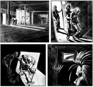 Se non avete ancora letto Mani nude, vi consiglio di partire dal fumetto. I disegni sono di Paolo Armitano e Davide Furnò, una coppia di disegnatori che più adatti non si poteva trovare. Il loro stile è moderno, un bianco e nero asciutto e duro, sfumato, dove serve, con qualche tono di grigio, senza mai sporcare le tavole, che rimangono nitide e di immediata leggibilità. Tutto è concentrato sui personaggi, quasi fossimo a teatro, mentre gli ambienti, quasi sempre chiusi (o notturni) e appena accennati, contribuiscono a creare l’atmosfera claustrofobica del racconto. Il tratto, sempre precisissimo, di Paolo e Davide conferisce la giusta espressività a sguardi, movimenti e atteggiamenti dei personaggi ed esprime in modo perfetto la tensione costante del racconto.