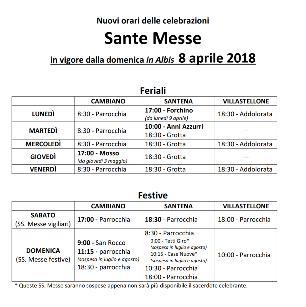 Analizzando il nuovo calendario (attivo a partire da domenica 8 aprile 2018) si nota che è stato fatto il possibile per non cambiare gli orari delle messe feriali: a Cambiano resta quella delle 8,30 (escluso il giovedì), a Santena (escluso il lunedì) e Villastellone alle 18,30 (per Villastellone solo al lunedì, mercoledì e venerdì). A partire dal 3 maggio la messa all’ospizio “Mosso” di Cambiano si sposta da sabato a giovedì alle 17 e già a partire dal 9 aprile quella a Santena al “Forchino” si sposta da sabato a lunedì alle 17.