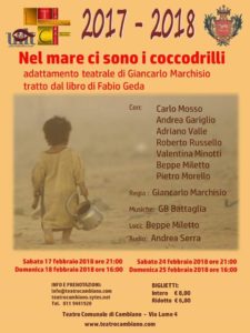 Ha debuttato ieri sera 17 febbraio 2018, al Teatro Comunale di Cambiano di via Lame 4, il Laboratorio Teatrale LTC con l’adattamento teatrale di Giancarlo Marchisio “Nel mare ci sono i coccodrilli”, tratto dall’omonimo libro di Fabio Geda. Andrà in replica anche oggi 18 febbraio alle ore 16, sabato 24 febbraio alle ore 21 e domenica 25 febbraio alle ore 16.