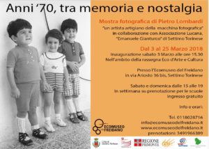 In occasione dei 60 anni di Settimo Torinese a Città, l’Ecomuseo del Freidano, nell’ambito della rassegna di mostre temporanee Eco d’Arte e Cultura, ospita (dal 3 al 25 marzo 2018) la mostra fotografica “Anni ‘70 tra memoria e nostalgia” di Pietro Lombardi, in collaborazione con Fondazione ECM e Associazione Lucana “Emanuele Gianturco”. Cento scatti in bianco e nero, scelti e catalogati tra 6.000 foto, che l’autore, piemontese d’adozione e lucano di nascita, ha impresso e conservato durante la sua carriera che si snoda in tutta la penisola e, in particolar modo, in Piemonte e in Basilicata. Le opere presentate racchiudono l’essenza di un’Italia raccontata attraverso il suo popolo da Nord a Sud.
