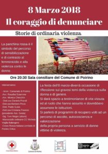 Ci stiamo avvicinando alla Giornata Internazionale della Donna, che in Italia viene celebrata dal 1922, per ricordare sia le conquiste sociali, economiche e politiche, sia le discriminazioni e le violenze di cui le donne sono state e sono ancora oggetto in tante parti del mondo. Per l’occasione giovedì 8 marzo alle 20,30 il Comune di Poirino, in collaborazione con la Croce Rossa Italiana e l’associazione “Casa delle donne Poirino” organizza presso la sala consiliare del comune il dibattito “8 Marzo 2018 – Il coraggio di denunciare, storia di ordinaria violenza”, un’occasione di riflessione sui gravosi temi non solo della violenza sulla donna ma in generale. Verrà dato spazio a testimonianze di vita vissuta, al ruolo che hanno assunto e dovrebbero assumere le istituzioni; si parlerà di programmi di recupero volti ad un percorso di ascolto e valorizzazione della propria persona a servizio di donne vittime di violenza. Interverranno il Sindaco di Poirino Angelita Mollo e l’Amministrazione Comunale, la Prof.ssa Sara Garbizza (Referente per la prevenzione del bullismo e cyberbullismo nell’Istituto Comprensivo), l’Avv. Rosalba Sciarrone, l’Avv. Monica Checchin, la Dott.ssa Daniela Prandi, la Dott.ssa Barbara Picco, il Dott. Paolo Guiso, la Dott.ssa Cristiana Pavesio (presidente Ass. Gesta), l’attore Ture Magro, il Maresciallo ordinario dei Carabinieri Michela Veglia Balangero, la Croce Rossa Italiana comitato di Poirino Onlus.