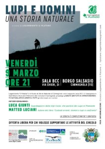 Questa sera (venerdì 9 marzo) alle 21, presso la sala conferenze della BCC a Salsasio di Carmagnola (palazzo bianco) ci sarà la prima serata del ciclo naturalistico di Legambiente Il Platano in collaborazione con il Museo Civico di Storia Naturale di Carmagnola e con il patrocinio del Comune Di Carmagnola. Lupi e Uomini: una storia naturale. I due relatori ci accompagneranno e racconteranno della presenza del predatore in italia e nelle nostre montagne anche grazie ad un ricco e coinvolgente progetto fotografico. Vi aspettiamo!