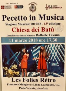 Nel pomeriggio di oggi, domenica 11 marzo, avrà luogo l’ultimo concerto della rassegna annuale “Pecetto in Musica”, giunta alla tredicesima edizione, ed organizzata sotto la direzione artistica del M° Raffaele Tavano. L’evento avrà luogo nell’antica Chiesa dei Batù, in piazza Roma, nel centro di Pecetto Torinese, alle ore 17:30. Si esibiranno Les Folies Rétro, gruppo che si compone con le voci di Francesca Mungiovì e Linda Lazzarotto, accompagnate dal pianista Paolo Volante. Il duo canoro nasce nel 2016 e vuole portare in scena lo spettacolo “The dueling duet”, innovativo progetto in cui le due musiciste intraprendono un dialogo canoro che a partire dalle musiche degli anni ’40 fino a pezzi più contemporanei, arrangiati ed eseguiti con l’accompagnamento al pianoforte di Paolo Valente, ultimo acquisto del gruppo, coinvolgeranno il pubblico. Questo spettacolo andrà in scena in sostituzione del concerto previsto nella rassegna. I concerti di “Pecetto in Musica” sono a ingresso con offerta libera. Per ulteriori informazioni è possibile visitare il sito web dell’Associazione www.accademiamusicaleartemusica.it oppure inviare una email all’indirizzo info@accademiamusicaleartemusica.it