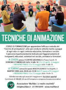 L’associazione “MULTIKER. Le molte creatività” propone il corso di “TECNICHE DI ANIMAZIONE” volto ad apprendere metodi efficaci per programmare e condurre attività rivolte a gruppi di ogni età e in ogni contesto educativo, formativo e sociale. Il percorso è particolarmente indicato per insegnanti, operatori e volontari del sociale, educatori, animatori, capi scout e tutti coloro che vogliono ampliare il loro bagaglio di competenze in campo sociale e artistico.