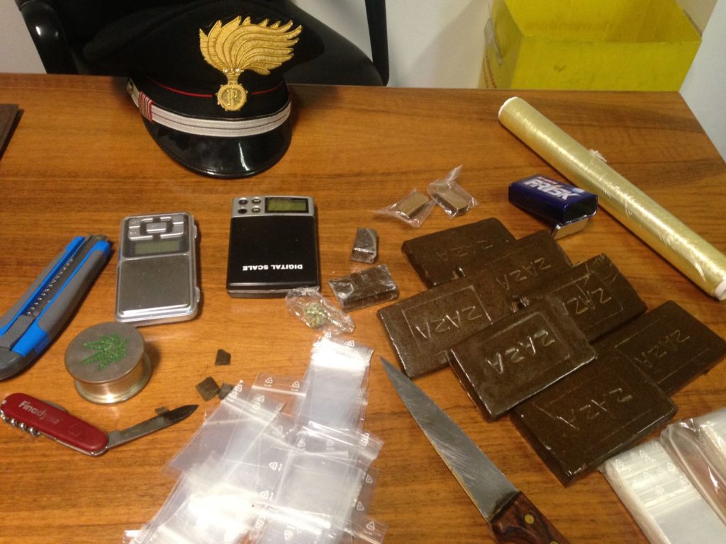 I Carabinieri di Santena e Poirino hanno tratto in arresto in flagranza un cittadino di Poirino, T.M. cl. 87, disoccupato, incensurato. I militari, durante un servizio di controllo del territorio congiunto in via Asti di Santena, hanno proceduto al controllo di un veicolo con a bordo il predetto; il controllo veniva esteso anche all’abitazione del soggetto, il quale consegnava spontaneamente ai militari nr. 7 tavolette di sostanza stupefacente del tipo “hashish” per un peso complessivo di circa 800 grammi, nr. 2 bilancini di precisione, circa 150 bustine in cellophane e altro materiale atto per il confezionamento. Il soggetto è stato tratto in arresto per “detenzione ai fini di spaccio” e sottoposto agli “arresti domiciliari” presso propria abitazione residenza, cosi’ come disposto dall’Autorita’ Giudiziaria.