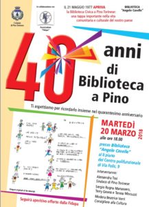 Martedì 20 marzo alle ore 18 nella Biblioteca di Via Folis 9 (II piano) l’Amministrazione comunale, in collaborazione con l’Associazione Fidapa, organizza l’incontro “40 anni di Biblioteca a Pino”, l’occasione per ricordare l’importante anniversario dell’apertura della Biblioteca civica, inaugurata il 21 maggio del 1977.