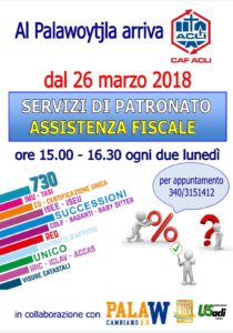Da lunedì 26 marzo 2018 al Palawojtyla inizia un nuovo servizio con l’apertura del Caf Acli. Questa nuova collaborazione permetterà a chiunque, ogni due lunedì dalle ore 15 alle ore 16,30, di avere a disposizione i servizi di patronato e di assistenza fiscale, con prezzi agevolati e convenzionati per i tesserati Acli.