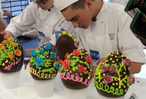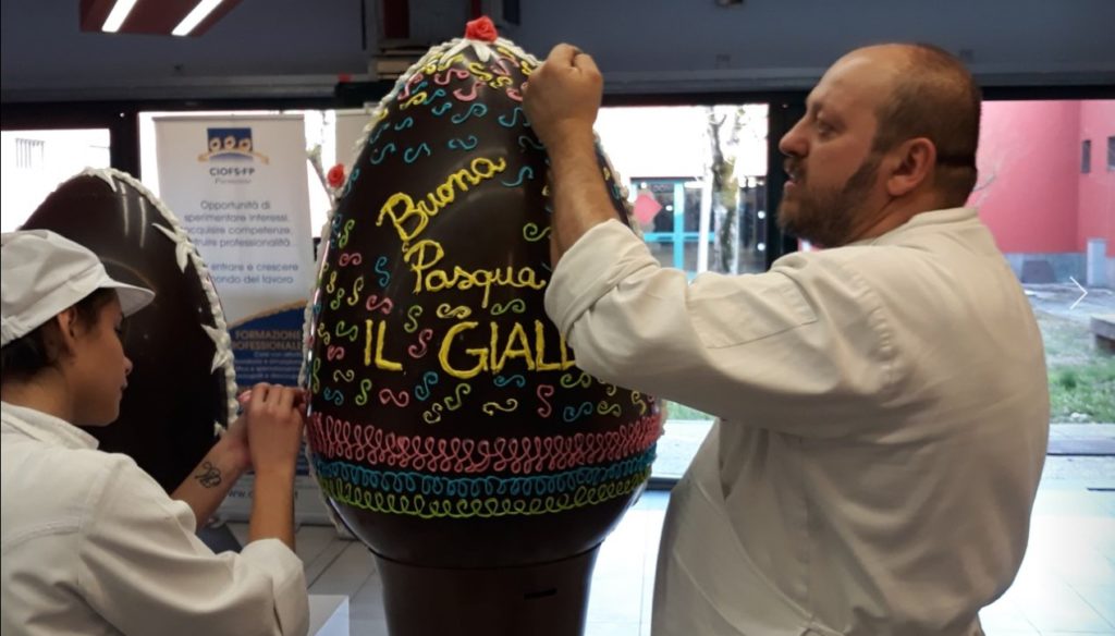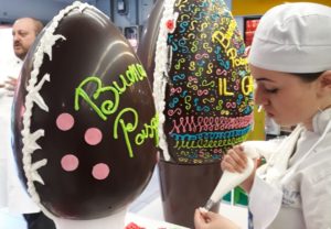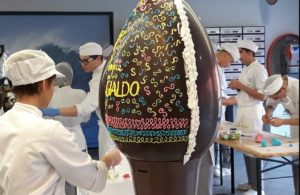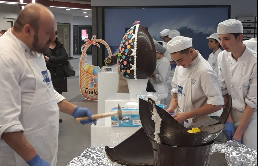 decorazione di due maxi uova di cioccolato in pasta di zucchero e ghiaccia reale e di un gran numero di uova più piccole. Un vero spettacolo, durato oltre due ore: alla fine, le uova più grandi sono state… prese a martellate, perché è uno spettacolo anche gustare dell’ottimo cioccolato, e fatte a pezzetti le uova hanno fatto la gioia della piccola folla presente, che ha a lungo applaudito i protagonisti dello show. Le uova più piccole verranno consegnate per Pasqua ai bambini dell’associazione ‘Casa Base’ che ospita