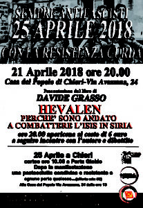 SABATO 21 Aprile alle ore 20.00 alla Casa del Popolo di Chieri in Via Avezzana, 24, presentazione del libro di DAVIDE GRASSO “HEVALEN, perchè sono andato a combattere l’Isis in Siria” . ore 20.00 Apericena al costo di 6 euro, a seguire incontro con l’autore e dibattito.