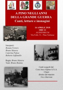 Bruno Masera, regista e interprete, con Renata Ferrero, Caterina Palese e Roberto Toffanello presentano a Pino Torinese lunedì 16 aprile 2018, ore 21, all’Auditorium di via Folis 9, la rappresentazione “A Pino negli anni della Grande guerra”. Canti alpini eseguiti dal Coro Arco Alpino ANA di Chieri, diretto da Nico Marrone.