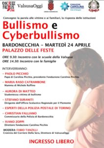 I temi del bullismo e del cyberbullismo purtroppo sono sempre più attuali. Nelle recenti cronache quotidiane, anche nel Torinese e in Piemonte, sono sempre più numerosi i casi di giovani vittime di violenze, insulti, persecuzioni da parte di coetanei o ragazzi poco più grandi, che terminano con un drammatico epilogo. Un tema di spinosa attualità, su cui il mondo della scuola non può voltarsi dall’altra parte: occorre confrontarsi apertamente tra famiglie, esperti, rappresentanti delle istituzioni e forze dell’ordine. L’ISTITUTO SUPERIORE FREJUS di Bardonecchia e il quotidiano on line VALSUSA OGGI organizzano per il giorno MARTEDI’ 24 APRILE a BARDONECCHIA un incontro pubblico dedicato alle scuole della Val Susa e alle famiglie, a cui parteciperanno esperti e forze dell’ordine, ma soprattutto dove si potrà ascoltare la preziosa testimonianza diretta delle vittime del bullismo e dei loro famigliari. A partire dal papà di Carolina Picchio (la ragazza novarese che il 5 gennaio si tolse la vita a causa del cyberbullismo) e dalla mamma di Michele Ruffino (il giovane di Rivoli che ha scelto di togliersi la vita buttandosi dal ponte di Alpignano il 23 febbraio scorso). All’incontro si potrà ascoltare anche la toccante testimonianza di Giulia (nome di fantasia), studentessa minorenne delle scuole medie perseguitata da alcuni bulli e che ha scelto di denunciare quanto subito.