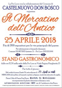 La Pro Loco, con la collaborazione del Comune di Castelnuovo Don Bosco (AT), organizza per il 25 aprile 2018 il il Mercatino dell’Antico con più di 200 espositori in Viale Regina Margherita, Piazza Dante, Via Seglie, Via dei Rivalba, Via Viglione, Via Roma, Piazza Don Bosco, Piazzale Piemonte. Un mercatino ventennale, di rilevanza nazionale per gli esperti del settore. Dalle ore 12,30, presso la sede estiva della Pro Loco, avverrà l’apertura dello Stand Gastronomico. Per tutto il giorno: – nel cortile di piazza Dante 24: sesta edizione di “25 Aprile in Cortile” Nericata dal mattino al tramonto ospiterà: artigiani, creatività, laboratori di argilla; – presso l’Ala di Piazza Don Bosco: Mostra di Modellismo con esposizione di plastici ferroviari e diorami a cura dell’Associazione modellismo GMSS sez. di Castelnuovo don Bosco.