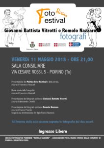 Venerdì 11 maggio alle 21 nella sala consiliare del Comune di Poirinosi terrà la serata di presentazione del Festival, a cura di Francesco Varacalli. Alessandro Crivello condurrà la presentazione del fotografo poirinese Giovanni Battista Vitrotti, mentre l’opera di Romolo Nazzaro sarà presentata
