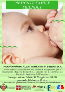 Sabato 12 maggio 2018 alle ore 10,00 verrà inaugurato, presso la Biblioteca Civica “F.lli Jacomuzzi” di via Lagrange 1 a Cambiano, il nuovo spazio di accoglienza per il nutrimento e l’igiene del bambino.